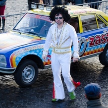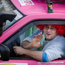 Czerwona peruka w różowym samochodzie